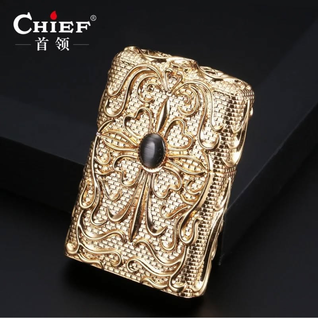 فندک بنزینی مارک چیف مدل صلیب نگین مشکی جعبه چوبی